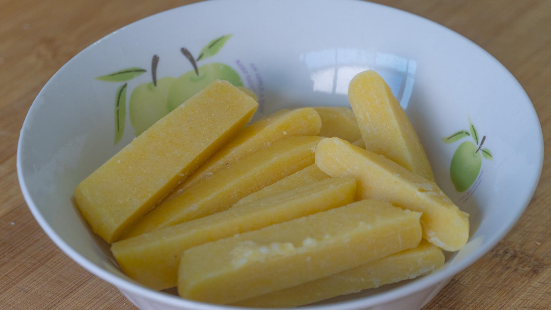 2、再準備200克玉米麪餈粑,切成小長條後先放一旁。