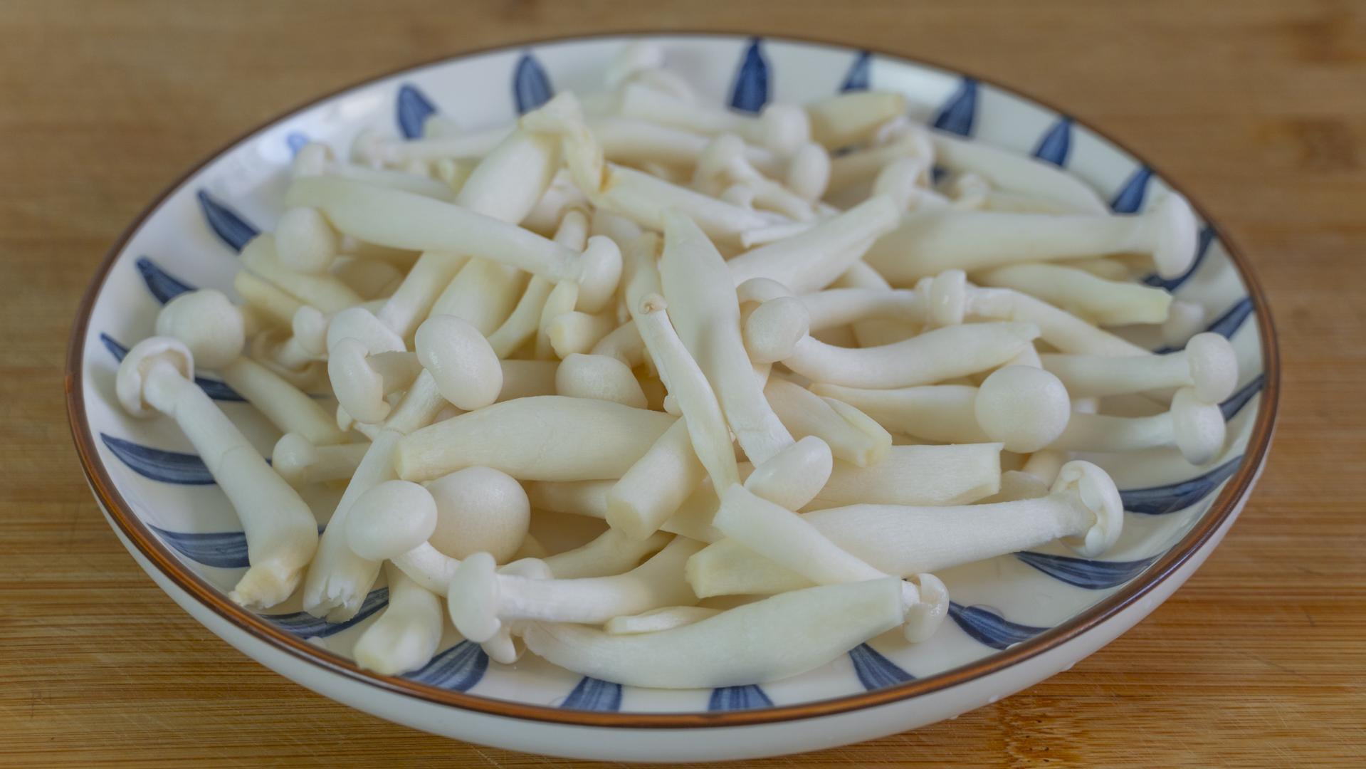 1、黑木耳1小把,加溫水泡發後洗淨;白玉菇1盒,去掉根部後洗淨,然後掰成小朵備用。