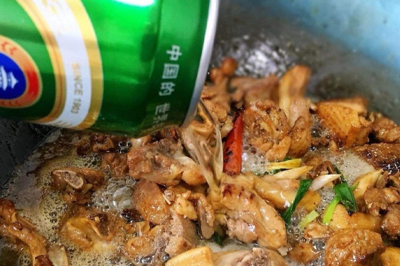 3、鴨肉炒好,倒入一罐啤酒沒過鴨肉,大火將啤酒煮開之後轉小火燉煮大約30分鐘。