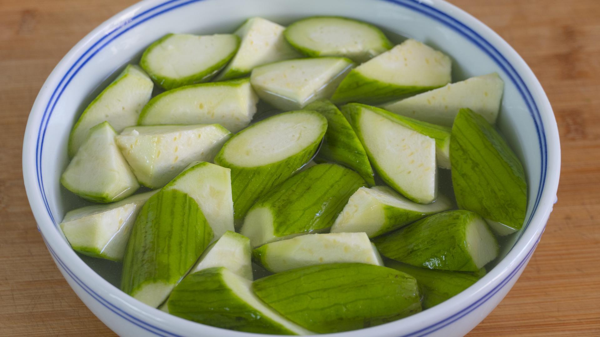 3、絲瓜兩條,洗淨後去頭去尾,然後輕輕的刮一下皮,再切成菱形塊兒。接着把絲瓜裝入碗裏,加清水泡着,避免氧化變黑。