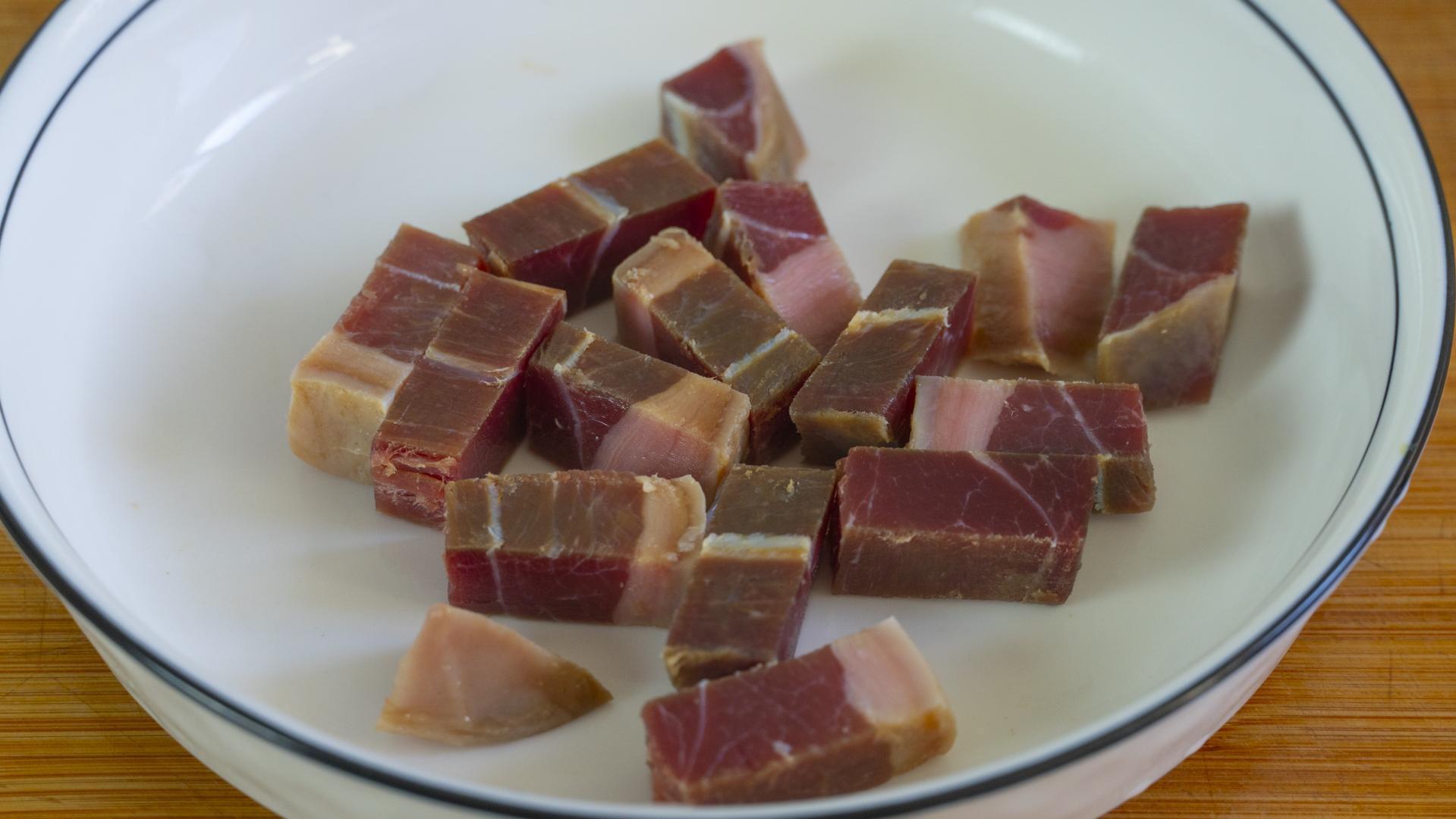 2、青豆80克,剝開後洗淨;火腿200克,洗淨後切成小塊兒。
