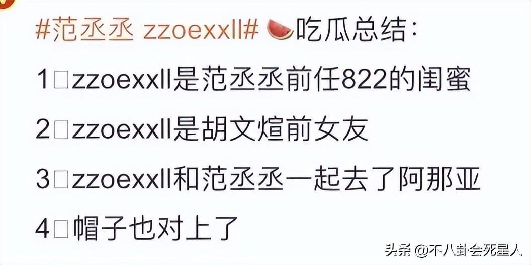 第五位被牽連進來的明星是胡文煊,zzoexxll是範丞丞被曝的緋聞對象,她也是範丞丞前任822的閨蜜,還是胡文煊前女友,而範丞丞和胡文煊是同一個公司的。