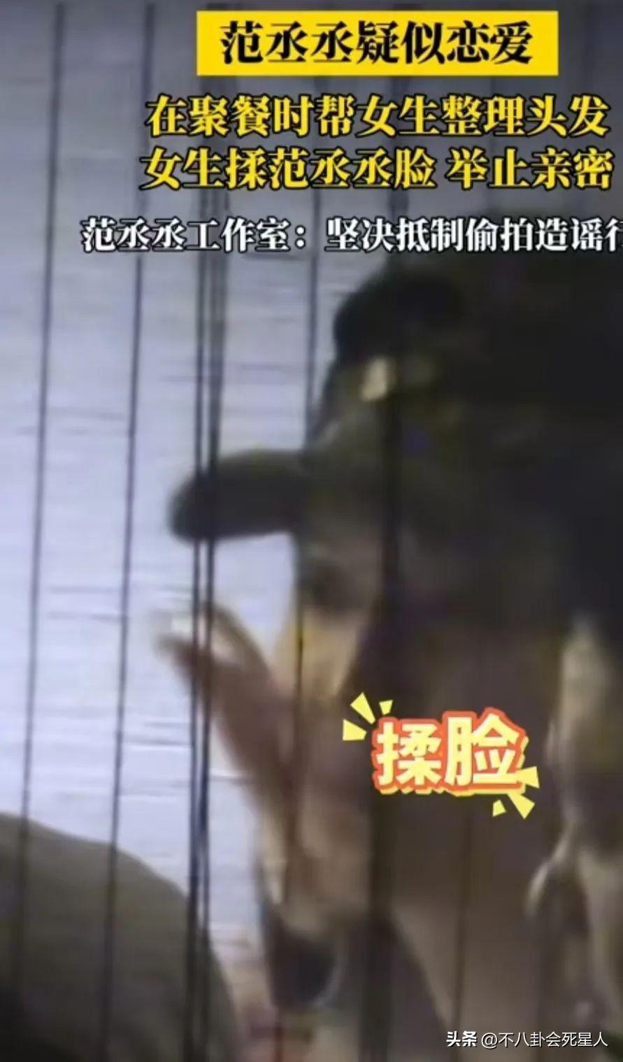 關於範丞丞的戀情緋聞,情況是這樣的,有媒體放出一則視頻,視頻中範丞丞與買超等友人聚餐,範丞丞旁邊坐着一位女生,範丞丞爲女生整理頭髮,女生去揉範丞丞的臉,聚餐結束後,範丞丞還主動摸了女生的下巴,二人動作十分親密,於是範丞丞疑似戀愛的消息不脛而走。