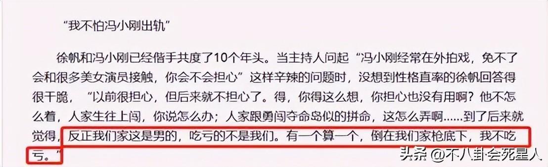 而徐帆當年面對馮小剛緋聞的那套回應,讓很多網友驚訝,她說反正他們家是男人,不喫虧,別人願意讓他佔便宜就佔唄,反正她覺得自己就是“護犢子”。