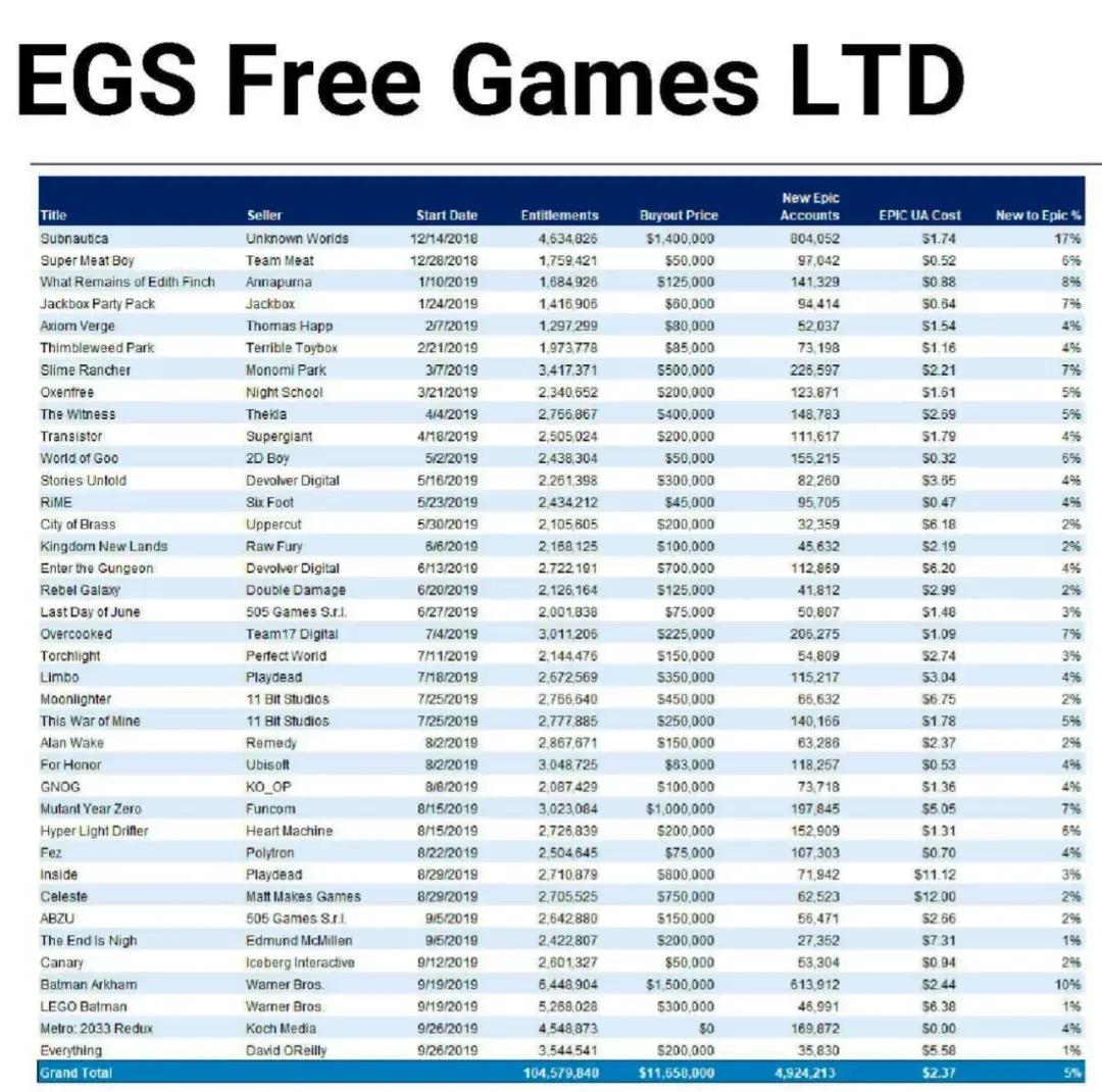 儘管Epic從未公佈過他們每週免費送遊戲的開銷,不過前些年蘋果和Epic鬧上法庭的時候,一份Epic內部文件在互聯網上流傳開來,數據顯示這家公司在2021年9月之前送出的42款遊戲總計花費1160萬美元,如果我們粗略估算一下,Epic至今爲止的投入應該不會低於1億美元。