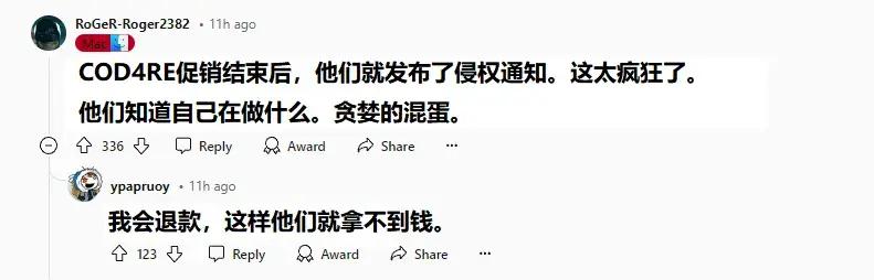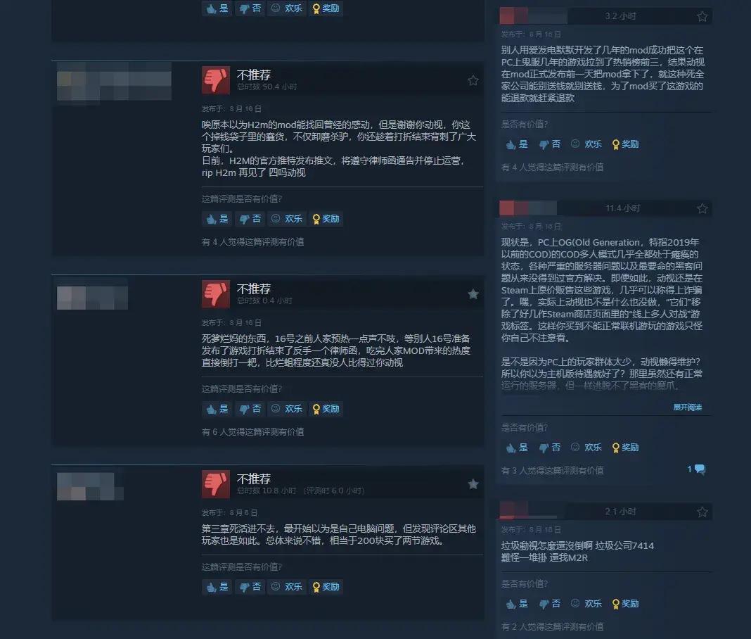 幸好Steam平臺有着相對完善的兩小時內退款政策和評測系統,不僅能夠將玩家的經濟損失降至最低,也在幫助玩家向動視傳達自己的悲憤。僅在一夜之間,從中文到外文,從粗俗的問候到文雅的詛咒,迅速佔領評論區,將COD4RE在Steam的近期好評率拉到了7%。