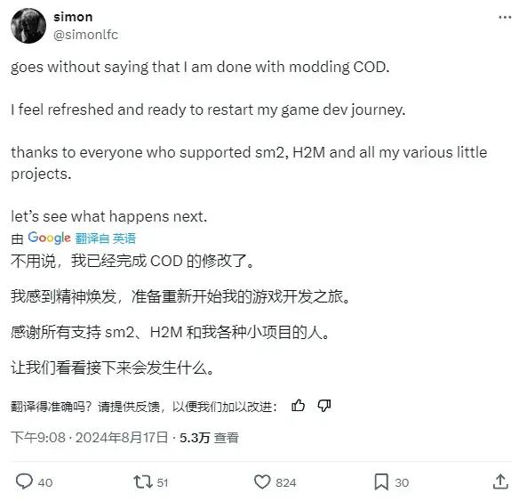 如Watchful Wolf這樣的前模組作者也徹底放棄了對動視的幻想。他在新建Discord的公告中宣佈,H2M和SM2達成了聯合,正在考慮開發一部自己的企劃或遊戲。還有SM2創始人之一、H2M開發者Simon,亦表達了想要自己開發遊戲的意圖。