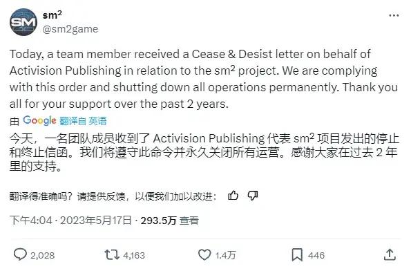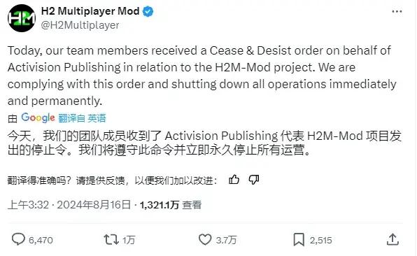 當天H2M官推就宣佈他們團隊收到了來自動視的侵權通知,並聲稱將“立即且永久關停一切運營”。在此之後,官推的簡介就只剩下了一個大寫的單詞:“已終結”(SHUTDOWN)。