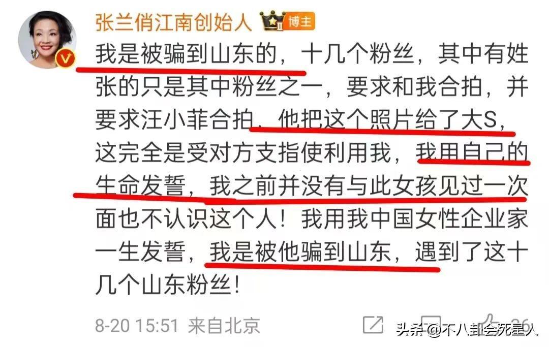 張蘭發佈了這條視頻後不久,在評論區留言,她說她不認識張穎穎,之前拍的那個合照是被騙了,以爲她是粉絲纔去合影。張蘭用生命發誓,她之前與張穎穎沒見過一面,都是被騙過去的。