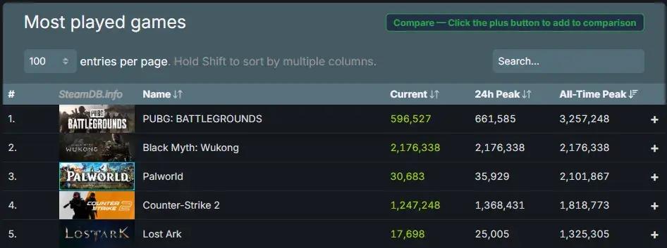 還得強調的是,今天可是週二工作日,《黑神話》的發售時間是上午十點,但破紀錄只用了幾小時。到了大家都辛苦一天下班後,《黑神話》的在線人數也進一步發力,先是超越了CS2歷史峯值(180萬),接着超過了《幻獸帕魯》歷史峯值(210萬),直接來到了Steam同時在線人數歷史第二的位置。