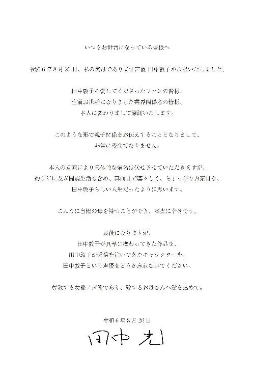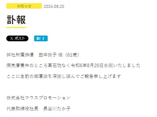 8月20日,日本聲優事務所MAUSU PROMOTION在網站發佈訃告,確認聲優田中敦子女士已於今日去世,享年61歲。
