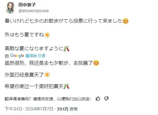 下午6點,田中敦子的兒子田中光在X上發表了悼念文章。根據文章,田中敦子已患病一年有餘,最終因病情無法控制離世,但具體病因出於田中敦子本人的意願,不會對外公佈。