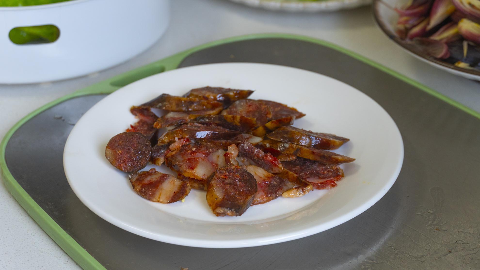 2、無論是香腸還是臘肉,和洋荷姜炒之前都要提前煮熟,這樣炒出來纔會好喫。