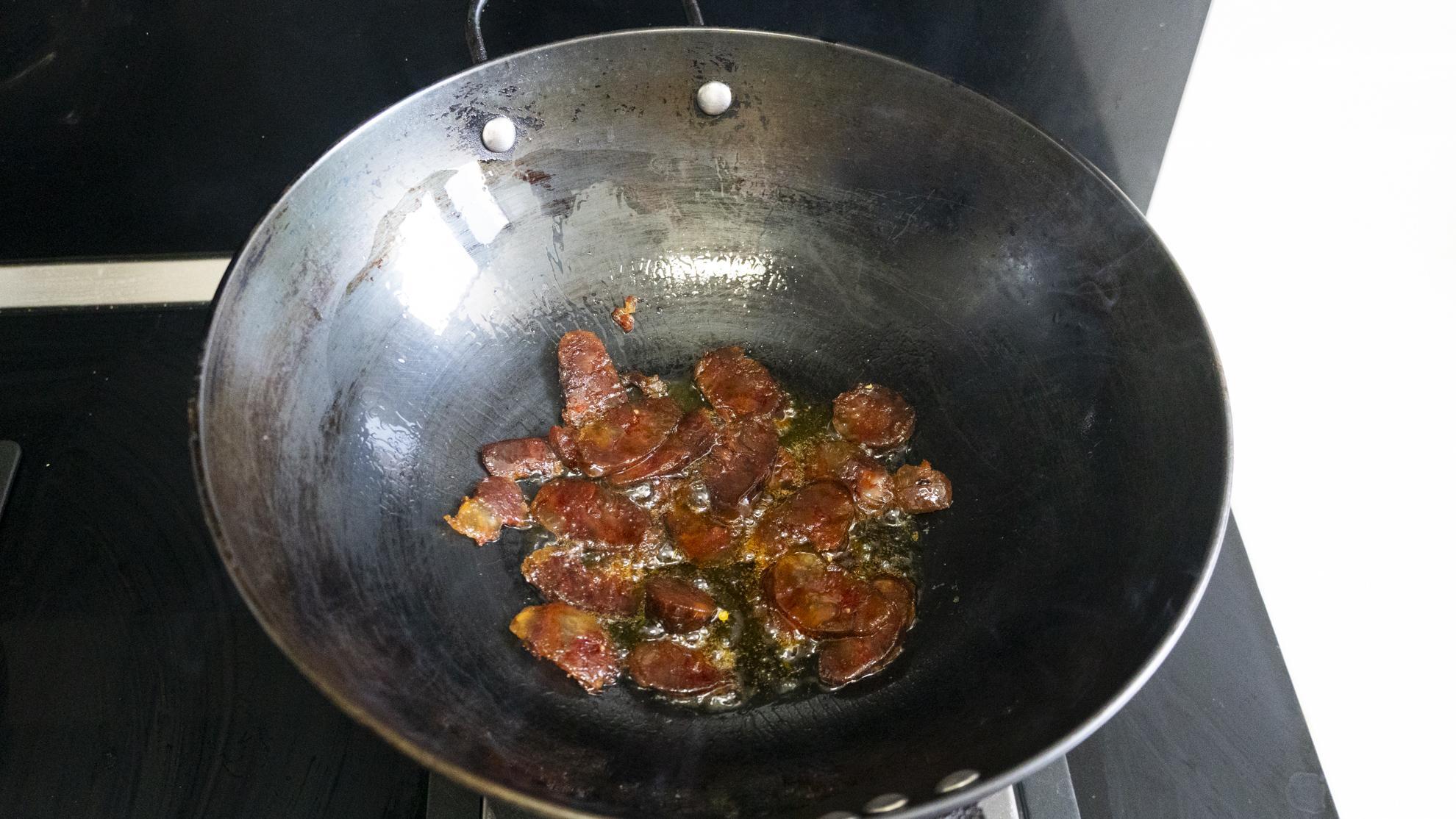 第五步:起鍋熱油,先把香腸炒出油脂,然後加點姜蒜幹辣椒炒香。