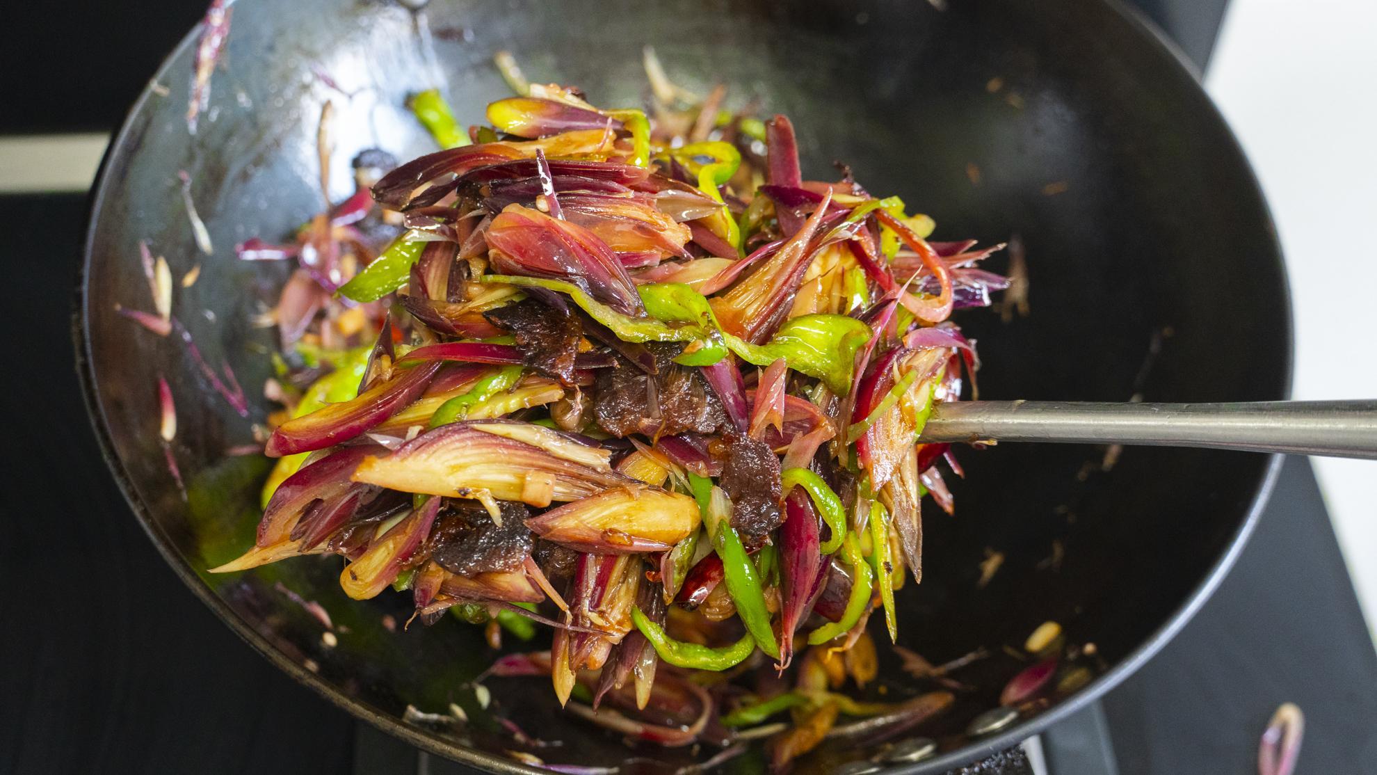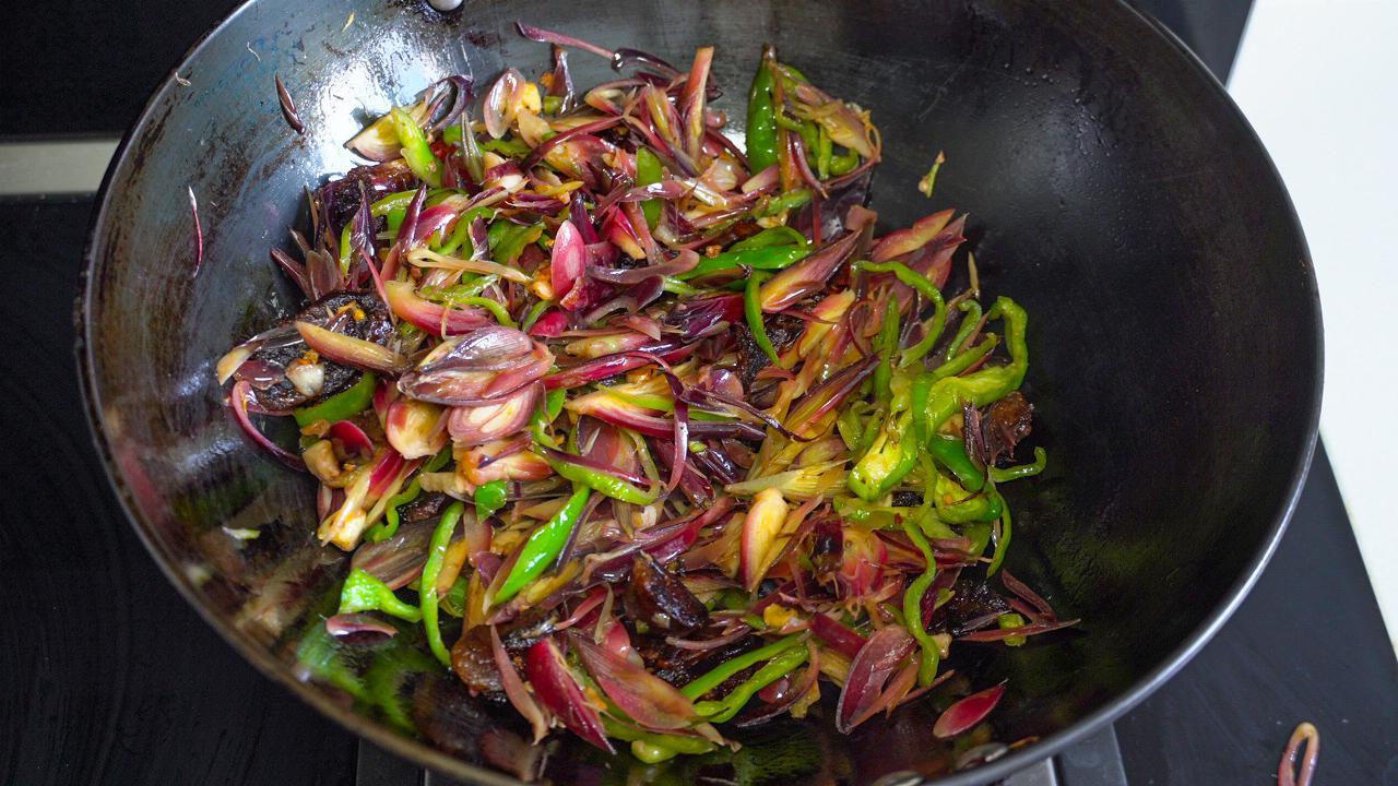 第六步:接着把洋荷姜和辣椒一起倒進來,大火翻炒均勻。