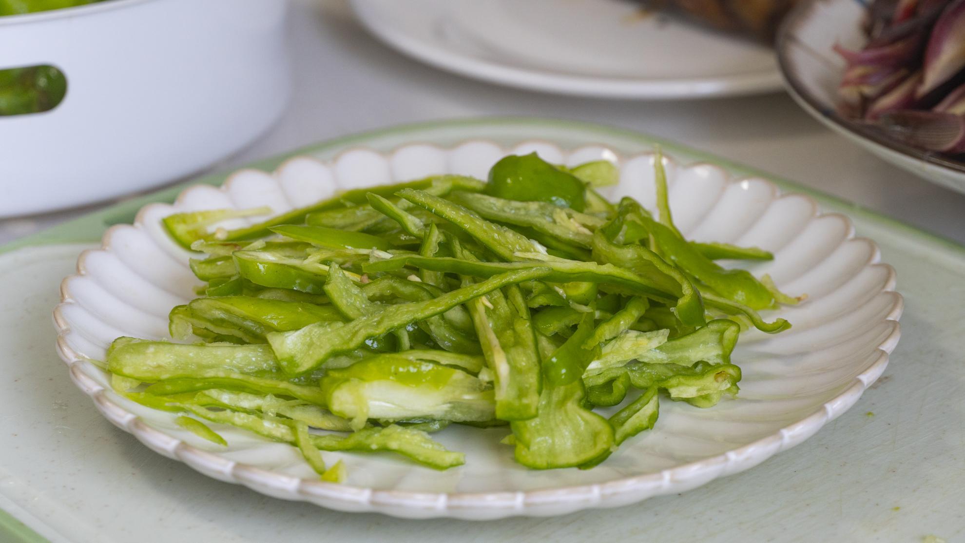 第三步:青椒準備2個,洗乾淨後去籽,然後切成絲。