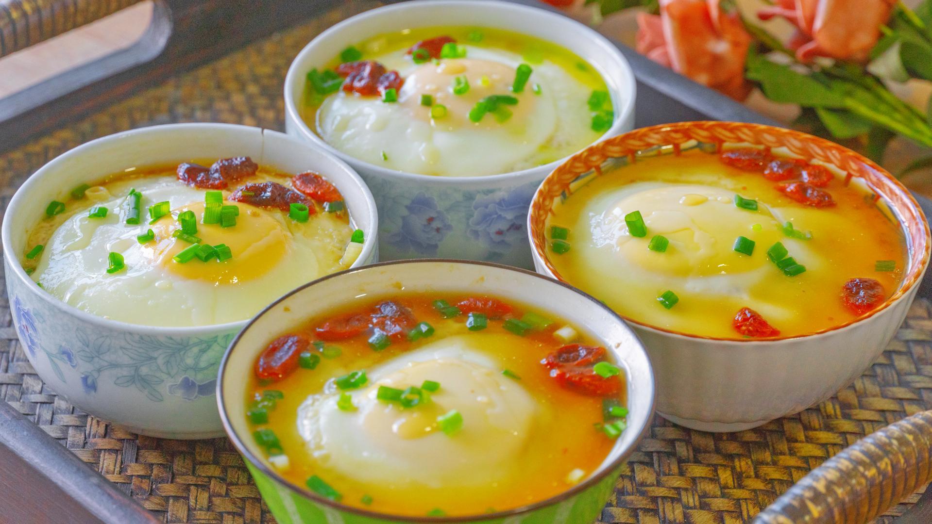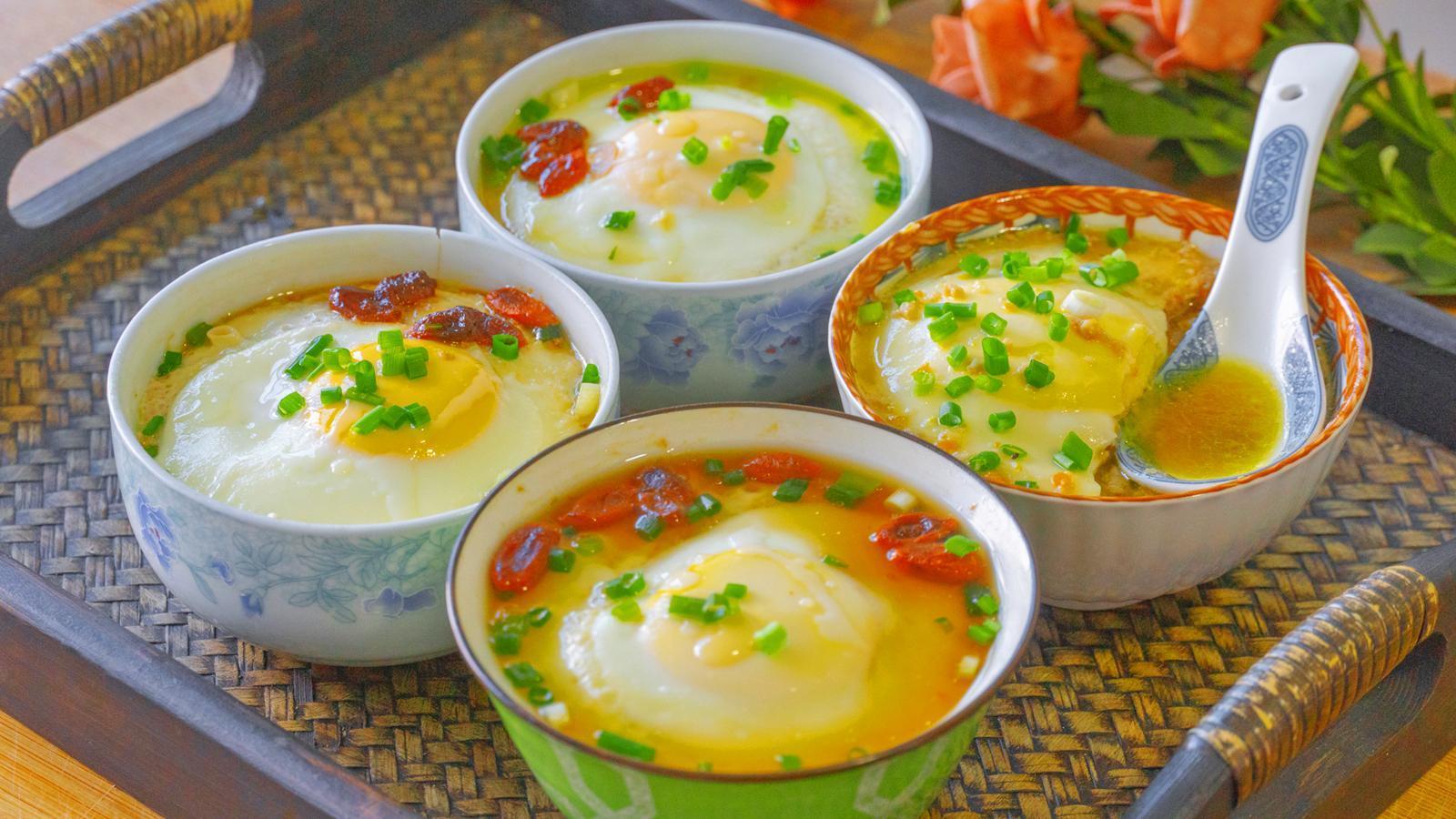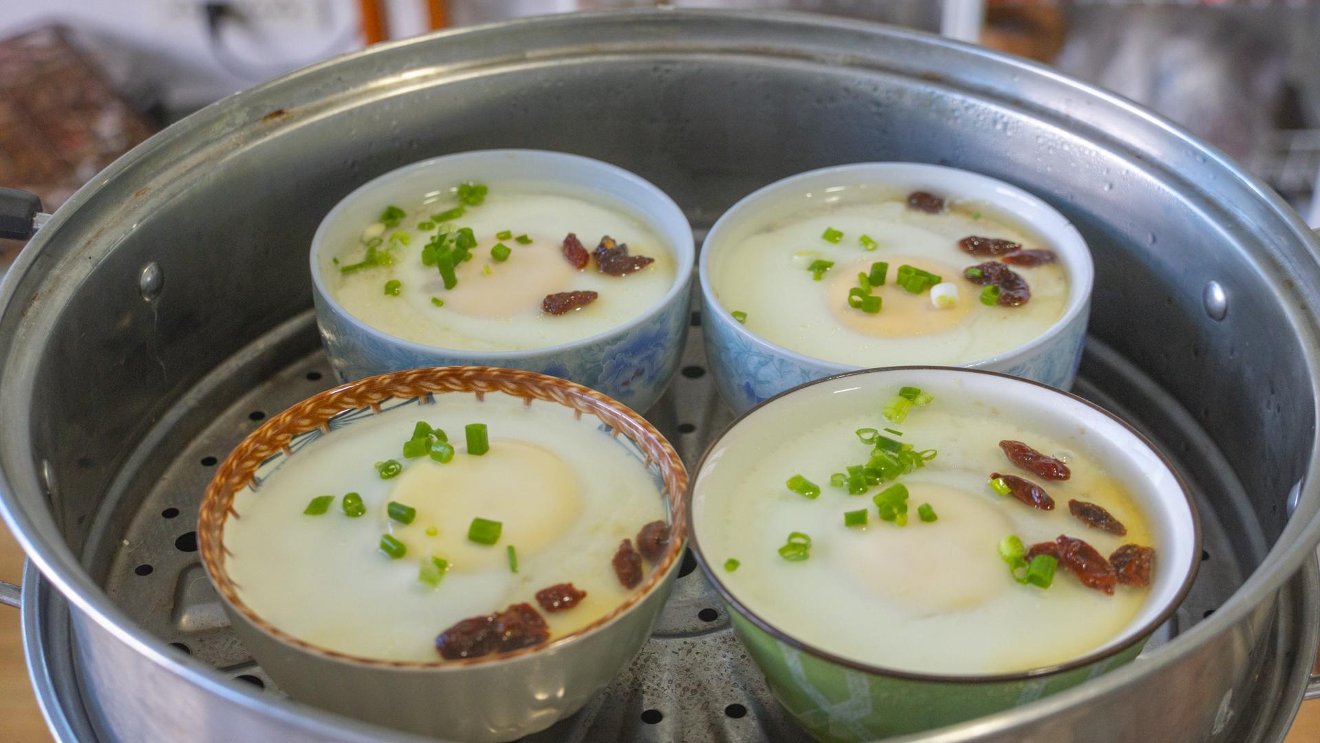 6、蒸肉餅的時間我們來切點蔥花,再泡一小把枸杞。8分鐘後我們開蓋看一下,蛋液凝固後再往每個小碗裏倒適量開水,然後放上枸杞和蔥花。