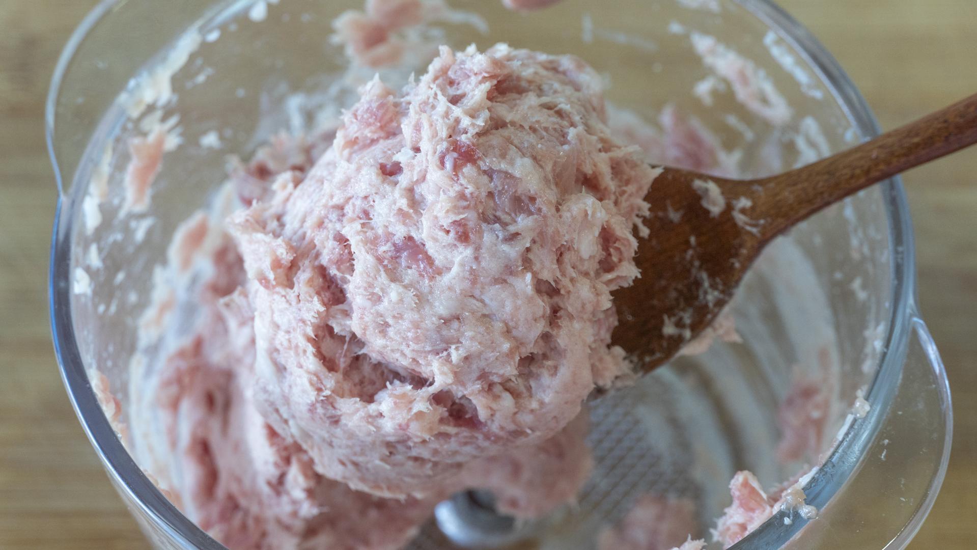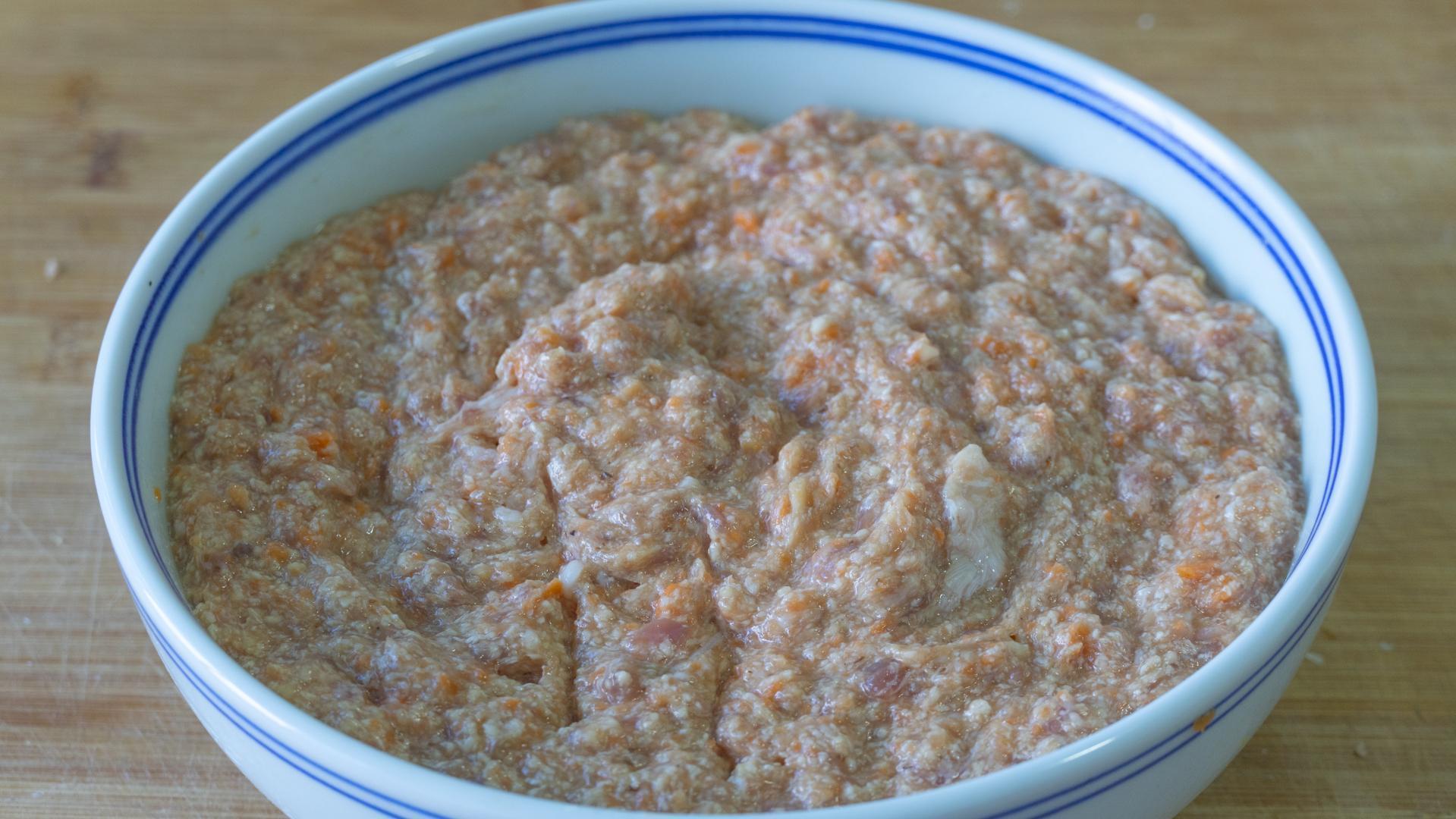 1、1斤半豬肉,洗淨後改刀切小塊兒,裝入絞肉機裏面後打成肉泥,可以多打幾秒,肉質細膩口感會更好喫,打好後先倒出來備用。