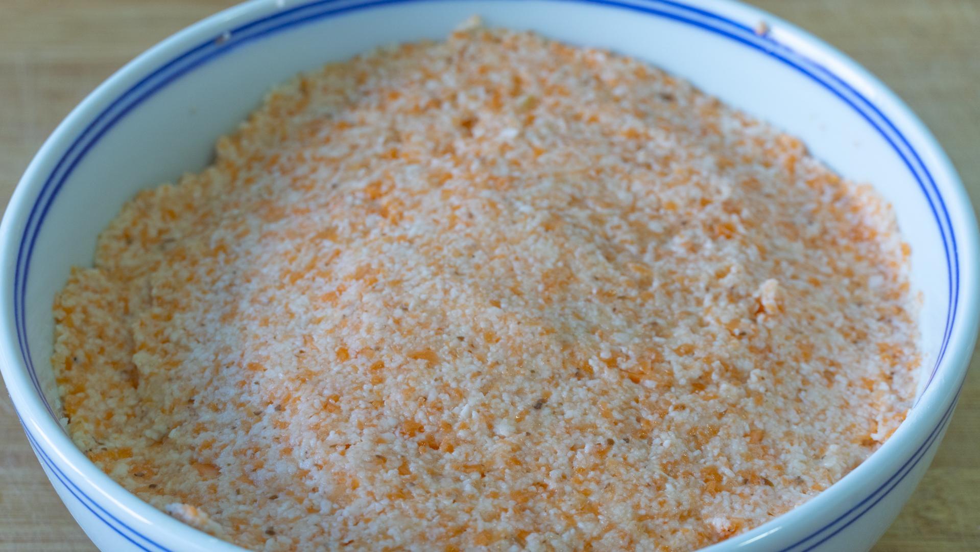 3、和山藥一起倒入絞肉機裏面,再加2個洗淨的香菇,一起打成細膩的蔬菜泥。打好後和肉餡兒裝一起。