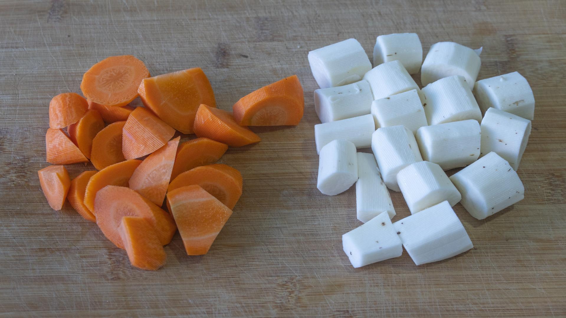 2、接着準備一根山藥,洗淨後先去皮,再切成小塊兒,切好後再來一根胡蘿蔔,去皮後也切塊兒。