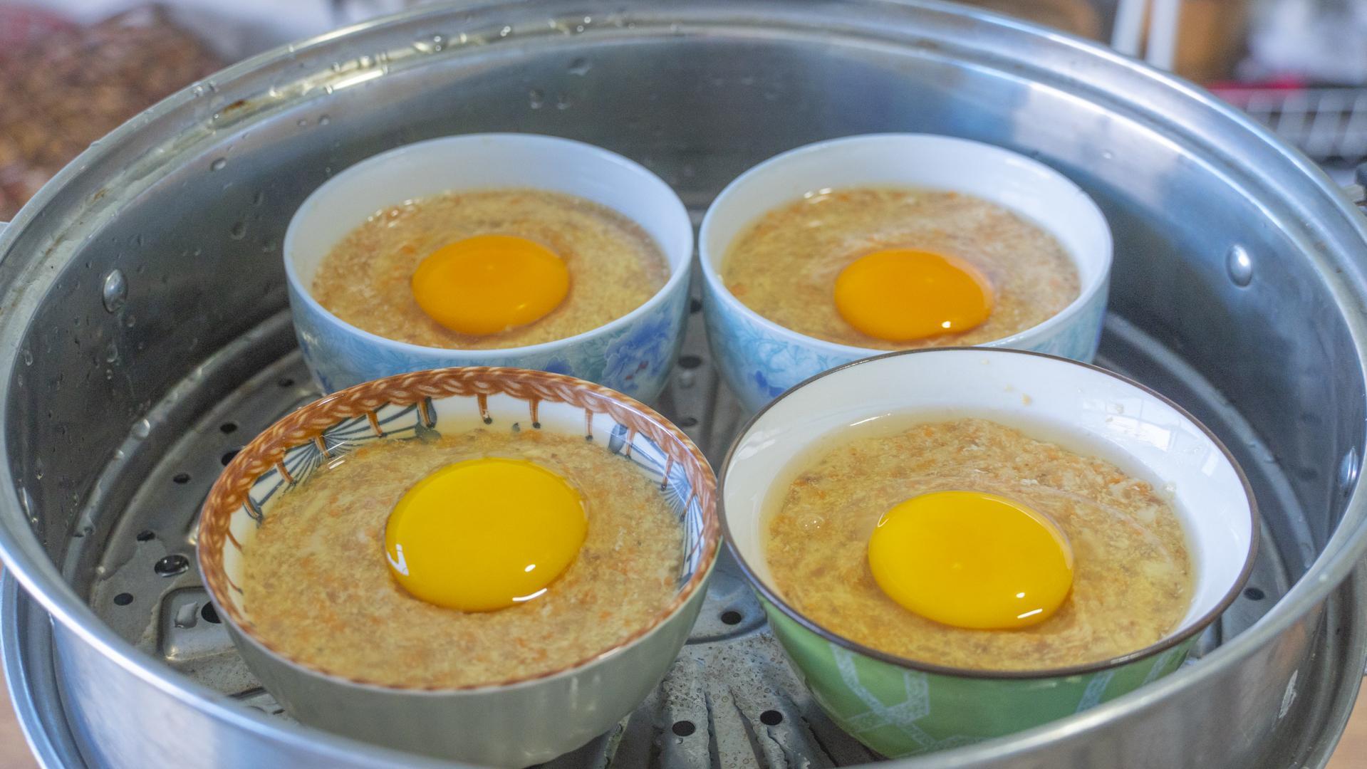 5、準備幾個小碗,再分別舀入2大勺肉餡兒,表面用勺子鋪平,然後在中間位置挖一個小坑,打入一個雞蛋。接着上鍋蒸,蓋上蓋子大火先蒸8分鐘。
