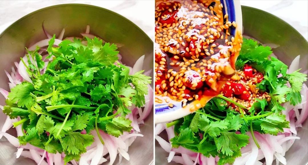 4、撈出瀝乾水分放入碗中,再加點香菜和黃瓜絲,淋入調好的料汁拌勻即可。