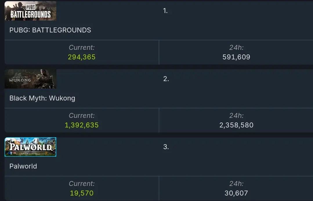 現在,steam在線人數榜單前三名的作品分別來自中日韓