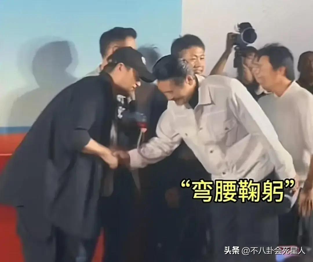 還有周潤髮出席《解密》宣傳會上,跟後輩王寶強,陳思誠握手的時候也是彎着腰盡顯謙卑,還說王寶強是他的“偶像”。