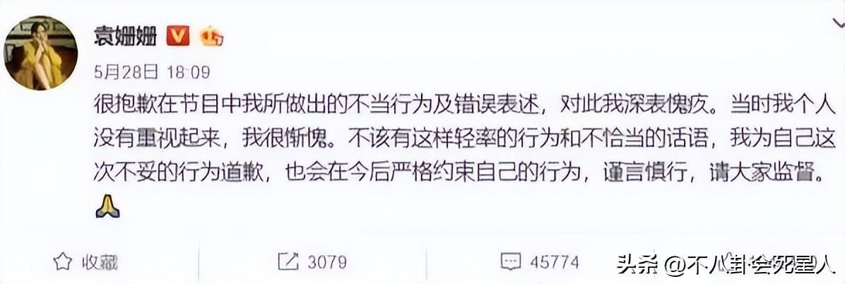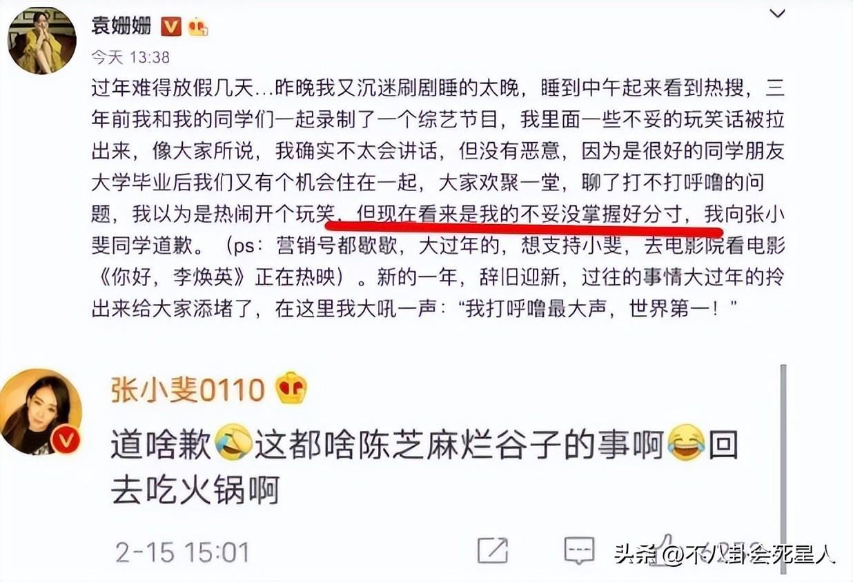 張小斐火了後,袁姍姍發文向她道歉,承認當時說話沒分寸,張小斐留言稱“道啥歉啊,回去喫火鍋”,她已經原諒了她。但很多網友還是因此不喜歡袁姍姍,質疑她是過來蹭熱度的,假如張小斐不紅,她不一定會發文道歉。