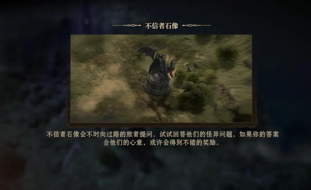 舉個例子,“撿垃圾”是許多遊戲大世界的基礎體驗,《龍息:神寂》也不例外,走幾步路都能看到各種材料、解密或者是奇遇內容。比如讓我印象很深的“不信者石像”,與石像交互後,他們會提出問題,並要求你揣測哪個回答最符合他的心意。