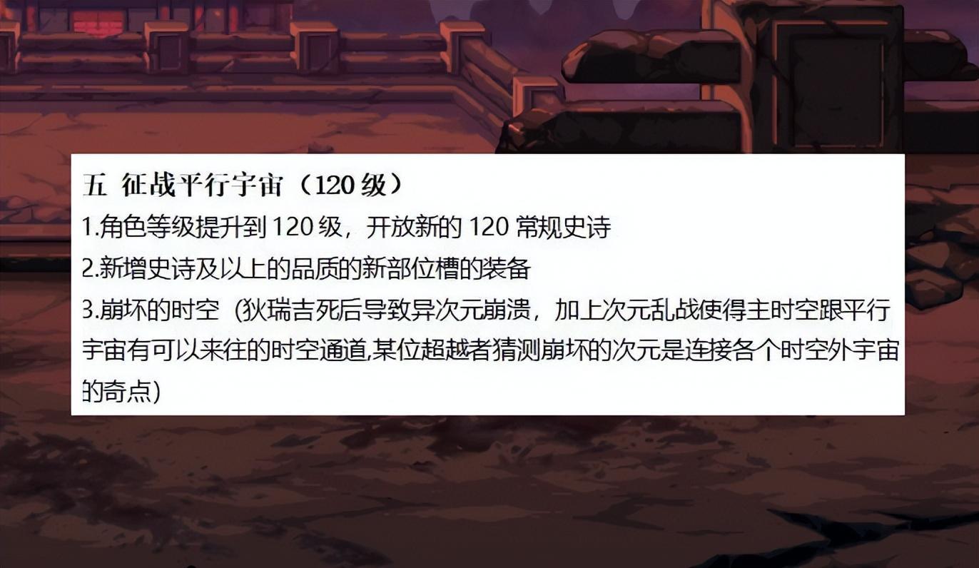 角色等級提升到120級,同時推出120級的常規史詩,以及開放新的裝備槽和裝備。