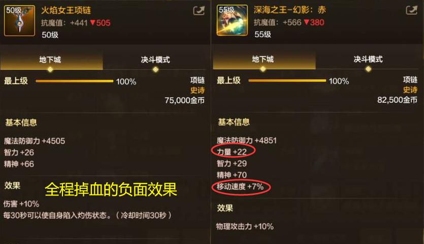 (2)“滄海項鍊”無負面效果,甚至還多了7%移速和22點力量面板,而“女王項鍊”則有全程掉血狀態,紅眼這種職業還可以接受,其他職業就比較爲難了。