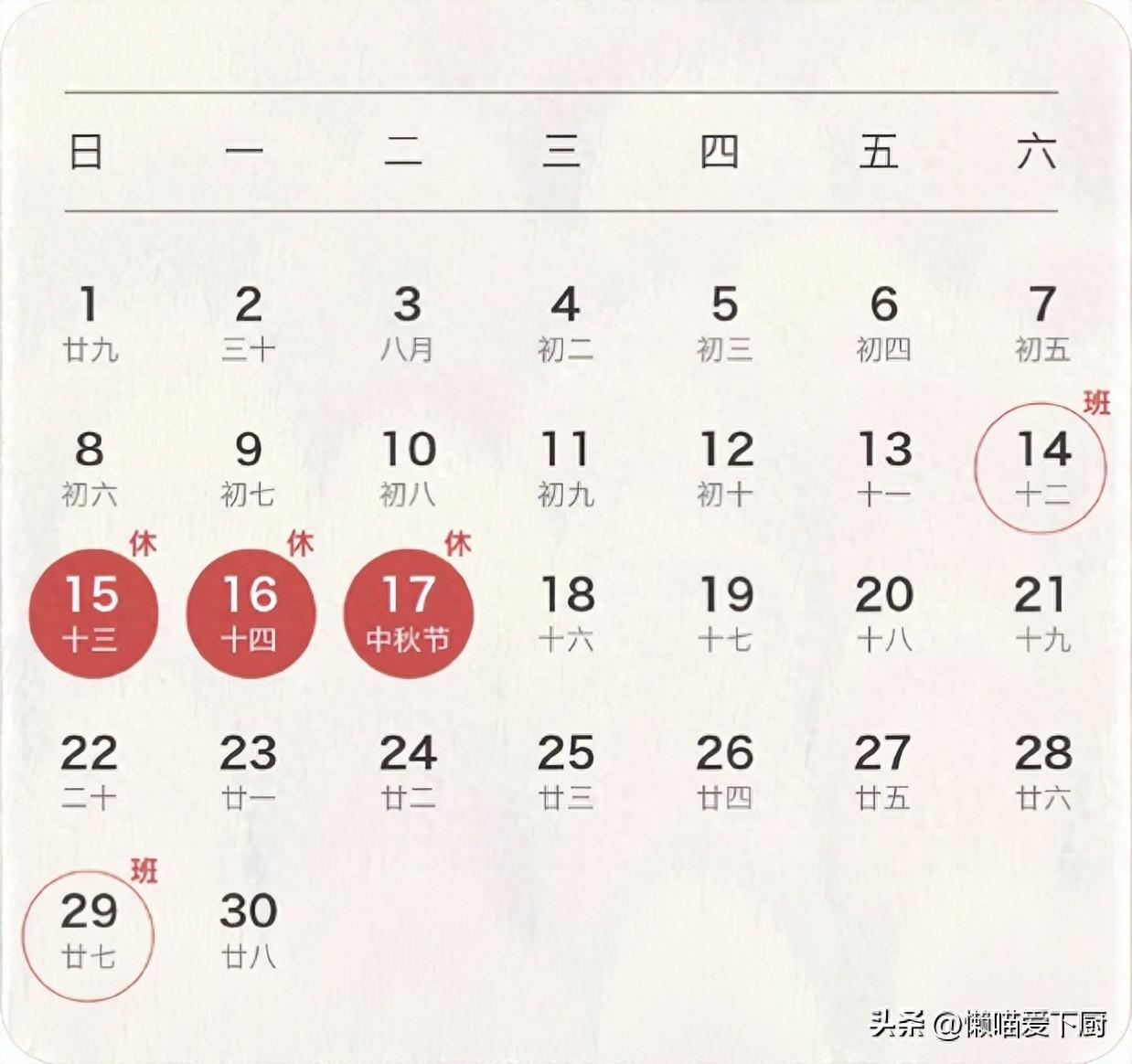 大家最爲關心的2024年中秋放假時間表已經出來了,和往年一樣,拼拼湊湊後共有3天假期,具體時間爲2024年9月15日至9月17日,分別是週日、週一、週二,9月17日(週二)爲中秋節,今年實際的中秋法定假期也只有9月17日這一天。爲了能實現連休,中秋節前一週的週末需要調休上班,並且因爲後面挨着國慶節的原因,中秋節後一週的週日也需要調休上班,對於這樣的假期安排,你還滿意嗎?