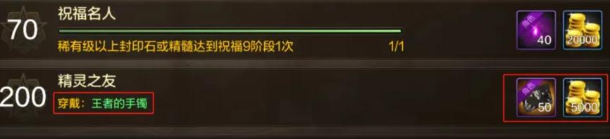 “王者的手鐲”,全屬強+7,屬性提升比較一般,不過它有一個“成就任務”,只要佩戴王者手鐲就可以拿到50深淵票、5000金幣、以及200成就點。