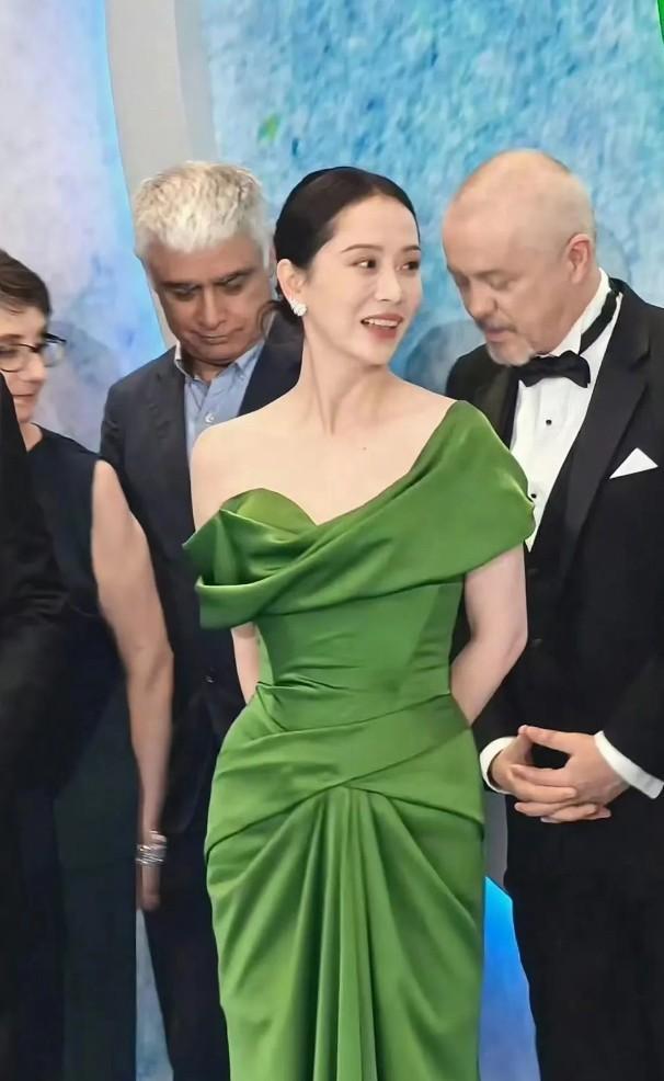 現身活動的海清,身穿一件緞面材質的綠色連衣裙,整個人顯得風韻猶存,白皙透亮的肌膚,還特別光滑緊緻,看不到一絲贅肉和皺紋。