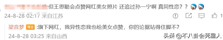 “梁音夢”的爆料更加是讓網友們驚訝,有網友還表示王思聰“性取向問題”,因爲王思聰追過不少美女。梁音夢則回覆,因爲他追的那些美女其實是他公司旗下的藝人,說白了只是“合作關係”。
