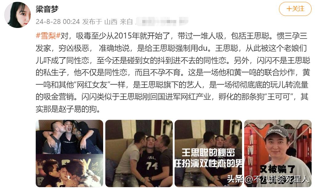 爆料裏提到,雪梨吸毒是從2015年開始的,帶過一堆人吸毒,其中包括王思聰。說雪梨是“慣三孕三”發家,而且是強制讓王思聰吸毒,並說王思聰因此被嚇到了,性取向也發生了變化。