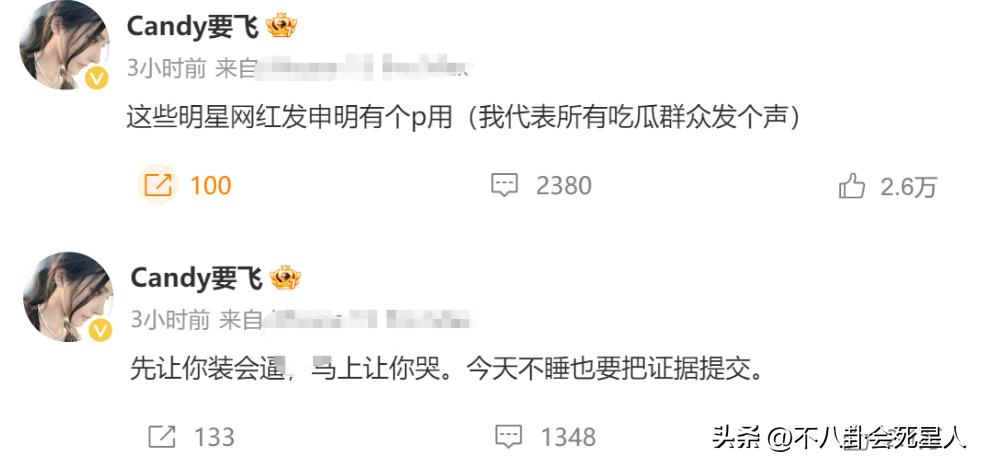 但“candy要飛”並沒有就此停止,併發文說這些明星網紅髮聲明有什麼用,還說後面會讓她哭,表示今晚不睡覺也要把證據整理提交。