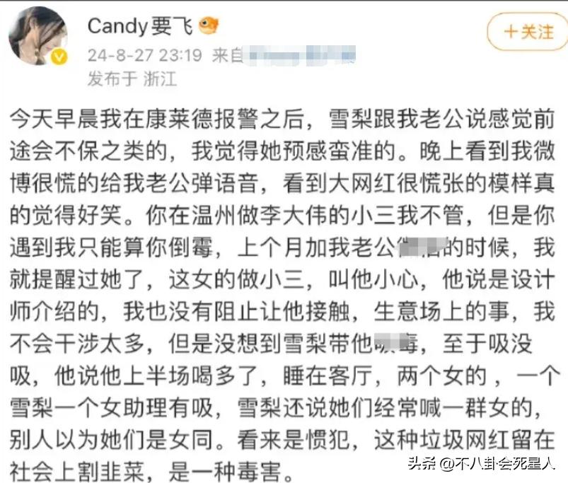 一開始是“candy要飛”這個賬號爆料雪梨帶着自己老公在酒店房間吸毒,而且在明知她老公有妻子的情況下還想當小三,還說雪梨之前已經當過李大偉的小三。