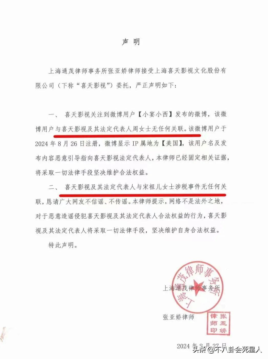 有網友開扒“小宴小西”,發現其疑似是喜天影視(宋祖兒前公司)老闆周宴西。隨後,喜天影視發佈聲明,表示“小宴小西”與周宴西無任何關聯,同時表明喜天影視及其法定代表人與宋祖兒稅務事件無關。