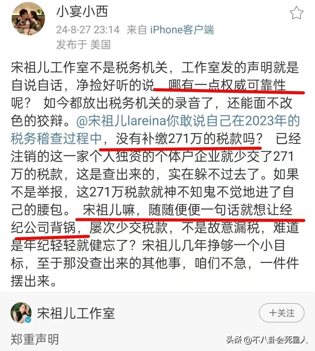接着,網名爲“小宴小西”的用戶,直接提出質疑,認爲宋祖兒工作室不是稅務機關,沒有權威可言,並稱宋祖兒補繳了271萬稅款,還讓經紀公司背鍋。