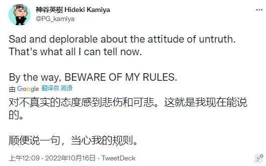 泰勒發佈視頻後,神谷英樹也發表了回應