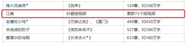 2019年,70萬字的《龍族V:悼亡者的歸來》後半段標題全是“但爲君故”,最終果然爛尾。2021年底還有人拉了個表格,統計部分作家的全年更新字數,江南一欄對應的是“73條抖音短視頻”。