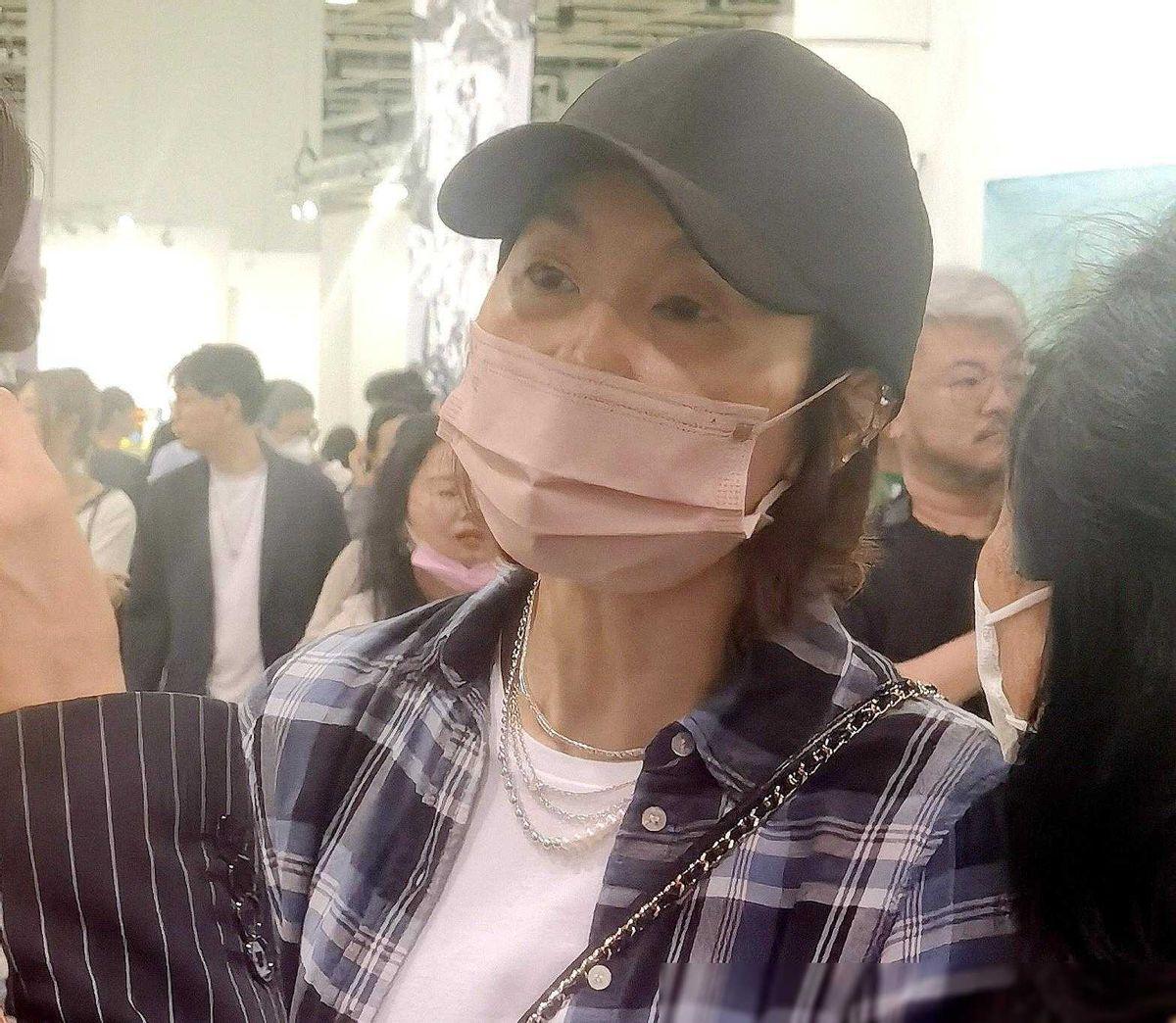 站在人羣當中的張曼玉,戴着口罩和黑色棒球帽,看上去和路人毫無區別。