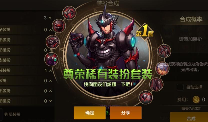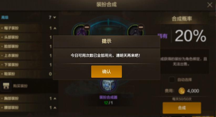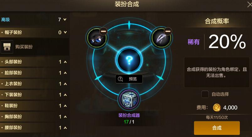 每次合成天空套所需要的材料爲「2件高級時裝+1個裝扮合成器+4000金幣」,有20%概率合成成功。