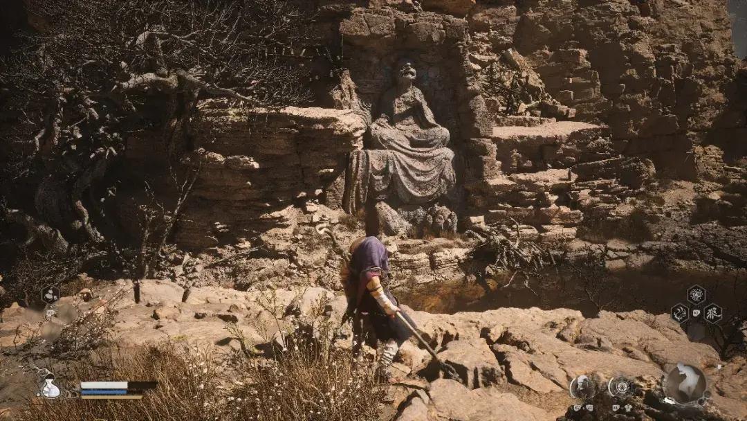 但對於《黑神話》來說,這種邊邊角角的景觀實在太多了。路邊隨處一抬頭,就能看到一尊全遊戲中獨一無二的佛像;再走兩步,又是一大面看起來很有故事的千佛石雕牆,但其實它們都是一個連精英怪都捨不得放的普通拐角。