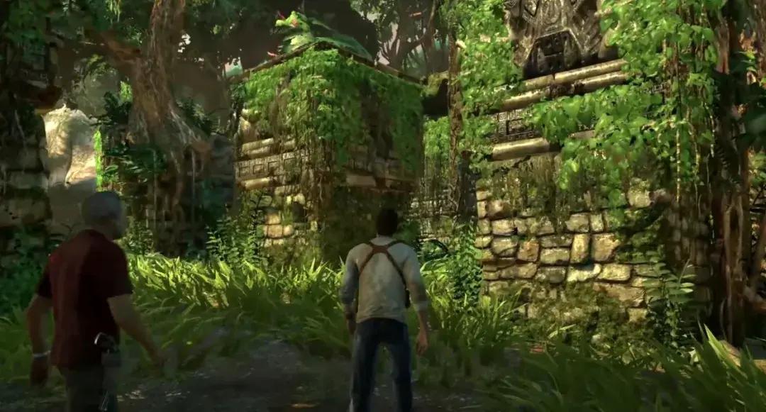 頑皮狗的概念與環境藝術設計師Robh Ruppel介紹,在遊戲的第二章,爲了做到真實可信這個預設目標,他們在地圖上下了很多功夫。周身長滿青苔的巨樹,滿地茂盛的野草,還有被綠藤包裹的石柱,都讓整張地圖放眼望去一片綠。利用極爲茂密的植被,他們成功讓玩家相信,這片古代廢墟的確隱藏在深山老林多年未被發現。