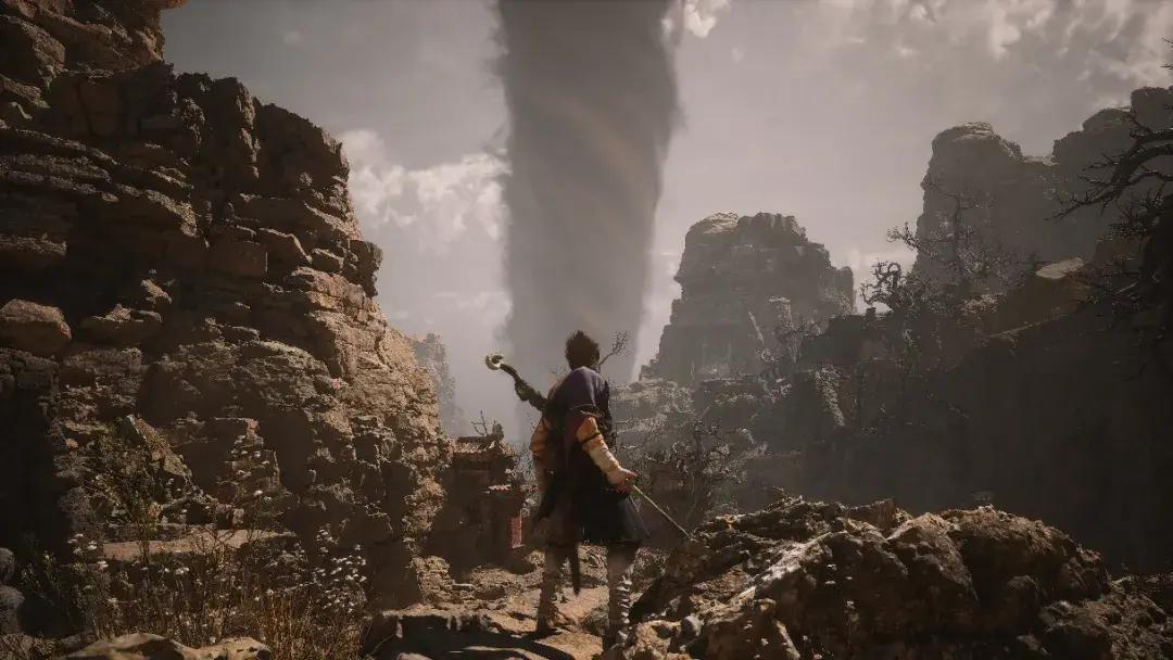 這種和環境融爲一體的天然路標,在《黑神話》中本來也可以有很多。黃風嶺的巨大龍捲風,紫雲山連向天空的絲線,都是自進入關卡的第一刻起就能看到的巨型奇景,它們也確實指向了關卡的最終Boss。