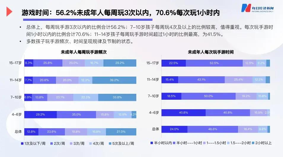 根據數據,有56%的未成年人每週僅玩3次遊戲,其中70%每次僅玩1小時。也就是說,新政實施三年後,至少一半以上未成年人的遊戲頻率和時長符合防沉迷政策規定,且遊玩時間在防沉迷政策要求的數據以下。