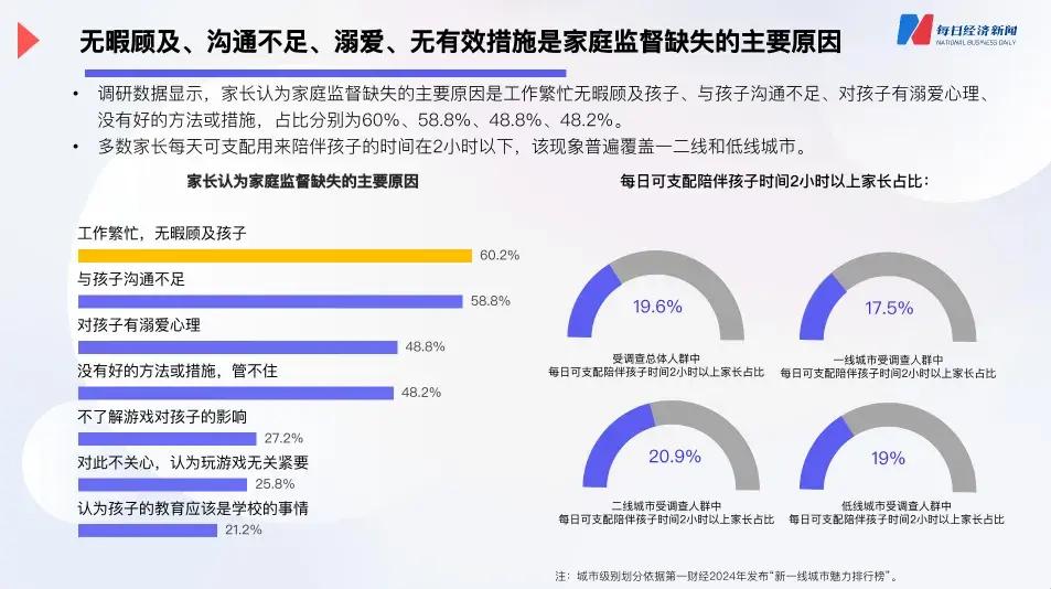 家長因爲工作繁忙導致的陪伴缺失和家庭監管缺失,未成年人缺少相對較長而完整的時間投入高質量娛樂,二者相加也從側面爲防沉迷政策的推進帶來了一些阻礙。